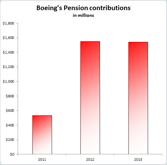 I believe one of the biggest problems with pension plans is that the obligation they represent is often skimmed over. Many investors are quick to notice a company's top-line revenues, bottom-line profits, cash hoards and debt levels -- but in the case of large companies like Boeing, its pension obligations are just as important. Consider that at the end of 2013, Boeing's total consolidated debt was $9.6 billion, yet its net pension liability was an even larger obligation at $10.4 billion.