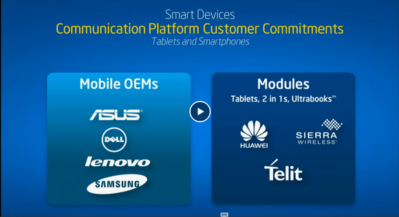 In Intel's Mobile World Congress keynote, Mobile GM Prof. Dr. Hermann Eul presented this slide outlining the four major "complete partnerships" (which are multi-year and multi-device) announced today: