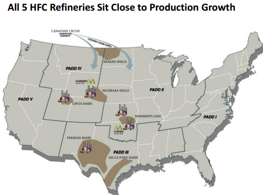 HollyFrontier's refineries, as shown above, are located close to the Mississippi Lime, Permian/Eagle Ford Basins, and Uinta/Niobrara formations, all of which are expected to report strong production growth over the next few years. In addition, HollyFrontier is the general partner of Holly Energy Partners, which owns several pipelines and storage facilities connecting these major production zones.