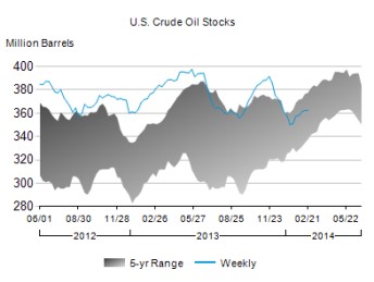 U.S. crude oil supplies stayed steady for the week ending Feb. 21, adding on just 100,000 barrels, according to an Energy Information Administration report (link opens a PDF) released today.