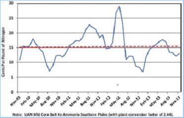 Nitrogen producers were at an advantage last year when natural gas prices hit multiyear lows. But extreme cold weather has pushed demand, and hence price of natural gas higher in recent months. CF Industries' fourth-quarter gas cost was 4% higher year over year, while Rentech paid nearly 30% more for gas during the quarter ended September 30, 2013. Comparatively, CVR's pet coke cost was 3% and 9% lower for its fourth quarter and full year 2013, respectively.