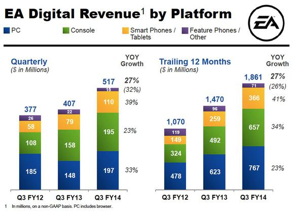 As illustrated in the image above, Electronic Arts' revenue from smartphone and tablets has been growing at a spectacular pace, but therein lies the problem. The company's smartphone and tablet revenue, collectively, accounts for just 21.2% of its overall revenue. This number, in turn, is comprised of software sales on iOS, Android, BlackBerry and Windows Phone platforms.