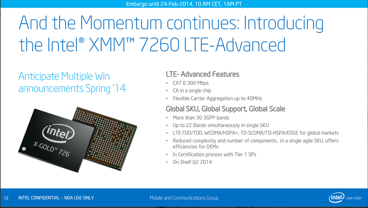 That said, Intel's modem group – late to the market with its first LTE modem known as XMM 7160 (which was supposed to be an early 2013 launch) – is making up for lost time with its latest-and-greatest XMM 7260, shown here: