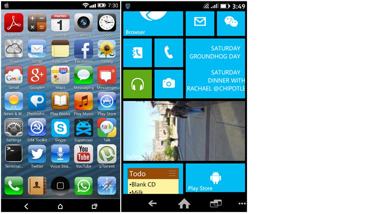Look familiar? Android phones can already be modified to look like an iPhone (L) and a Windows Phone (R). (Source: Technorms.com)