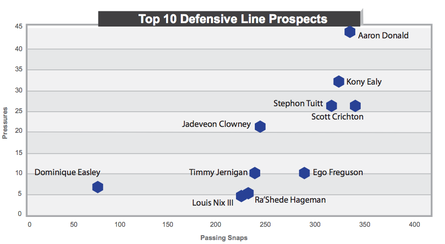 According to a report sent to me from STATS, Clowney was significantly better at pressuring the quarterback than any other top D-line prospect who played between 200 and 250 passing snaps last year. He generated almost the same number of pressures as most peers who received nearly 100 more shots at the QB.