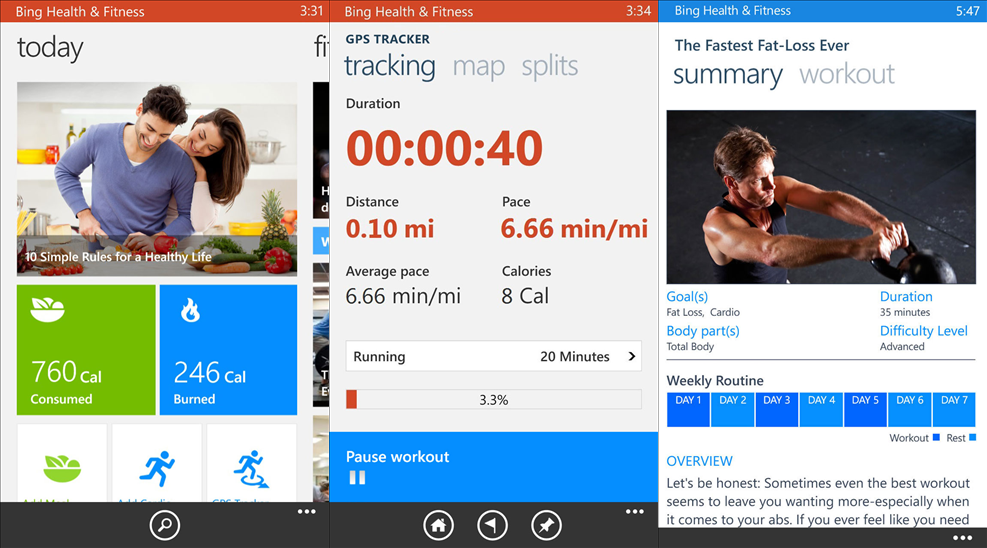 Microsoft recently released its Bing Health & Fitness Windows Phone app, an all-in-one personal fitness solution that allows users to set their daily calorie goal, record what they eat, and access nutritional information for over 300,000 foods. It also features workout and exercise tutorials, a GPS tracker to record activities and calories burned, and the ability to check information on possible health problems with its Interactive Symptom Checker.