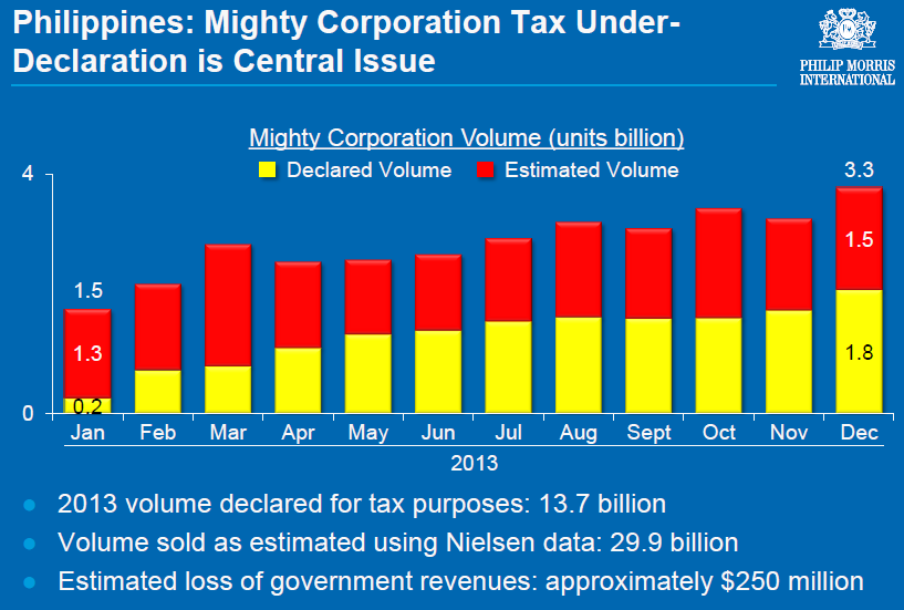 As we can see, by under-declaring the volume of tobacco sold by around 50%, Mighty has an unfair advantage over Philip Morris. With taxation rules changing, this under-declaration should soon be brought under wraps and Philip Morris should benefit with its national distribution network, internationally recognized Marlboro brand, premium pricing, and corporate accountability.