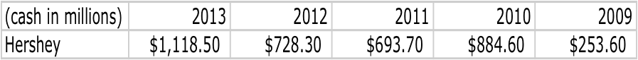 At the end of its 2013 fiscal year, Hershey reported that it held cash and cash equivalents of approximately $1.1 billion. Although this is just a fraction of the $40.7 billion in cash held by Apple during its most recent fiscal quarter, it represents a significant jump compared to the $253.6 million the company had on its balance sheet in 2009.