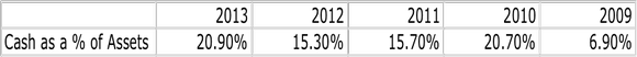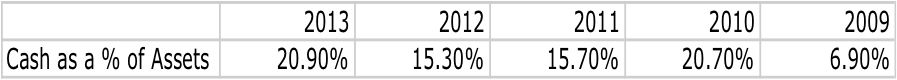 But the big question here is not how much cash the company has on hand. Rather, it's whether or not the business has too much. As businesses grow, it's reasonable to expect them to hold more cash so that they can service their operations, so a nominal perspective won't grant the Foolish investor much insight. Instead, we should be looking at cash in relation to total assets, as demonstrated in the table below: