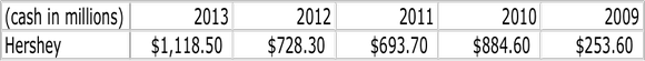 Based on the table above, we can see that Hershey's cash has risen every year since 2009, with the exception of the drop it experienced between 2010 and 2011. The jump in cash should be encouraging for shareholders because of the opportunities that it can afford them. However, having too much cash on hand can be a hindrance, as it can leave management wasting opportunity by keeping it in the bank or can prompt the company to make poor investment decisions solely for the purpose of using its cash.