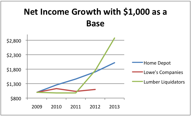 In all fairness, Home Depot's market capitalization is about 38 times that of Lumber Liquidators and its revenue is nearly 79 times greater, so the smaller rival should be growing more rapidly just because of the size difference.