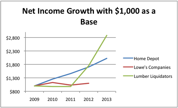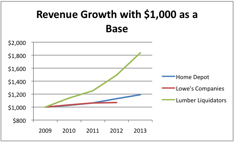 Probably the only company in this space to significantly outpace Home Depot's growth was rival Lumber Liquidators (LL +0.00%). Over the past four years, the company saw it revenue soar 49% from $544.6 million to $813.3 million. For its 2013 fiscal year, revenue popped 23% to $1 billion.