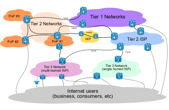 Tier 1 networks come together as a single entity. By definition, they all have direct peering agreements with one another and will neither pay nor bill other Tier 1 networks any fees for accepting these data streams. These networks take transit payments from Tier 2 connections and below, but once you're in this particular cloud, you'll be able to reach the edges of any other Tier 1 networks at no additional cost.