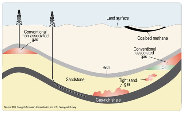 The following diagram shows the many different geologic formations that are known to hold natural gas.