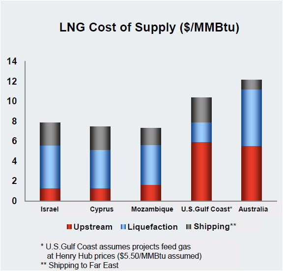 Still, 3.5 tcf is enough gas to supply Israel for several decades, with enough left over to export. Even better, Noble estimates that the costs for LNG from Israel or Cyprus to the Far East are well under comparable facilities in the U.S. and Australia.