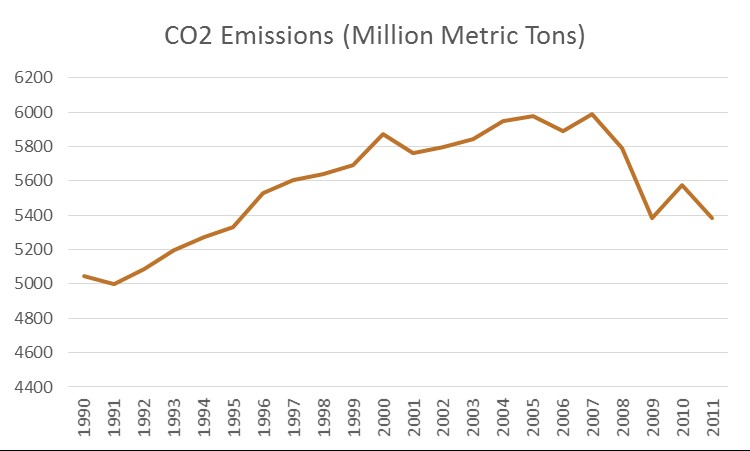 The U.S. Energy Information Administration released its latest state-specific data on carbon dioxide emissions, and emissions are down nationwide. In 2011 (most recent data), U.S. emissions clocked in at 5,384 million metric tons, down 3% from the previous year, and 10% from 2007's record high.