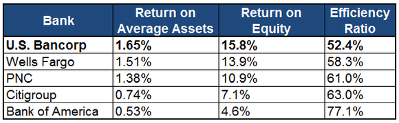 In a comparison against some of its peers, including Wells Fargo, PNC, and Citigroup, U.S. Bancorp delivered stunningly profitable results. Its return on assets and equity far outpaced its peers, and its efficiency ratio -- which measures the cost of each dollar of revenue -- was also best in class: