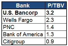 As a result, it should come as no surprise U.S. Bancorp's price-to-tangible book value -- the key metric used by investors to gauge a bank's value -- is also at the top of its peers as well.