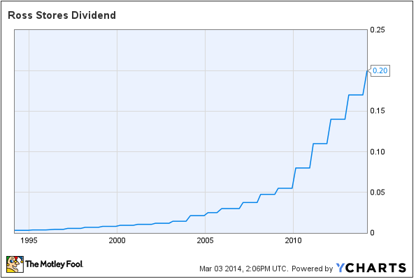 On Feb. 27, Ross Stores announced a whopping 18% increase of its dividend, to $0.20 per share. The dividend yield is 1.1%, which is not particularly high. However, the company has a smart business model, and the payout ratio below 20% of earnings leaves plenty of room for dividend growth in the years ahead.
