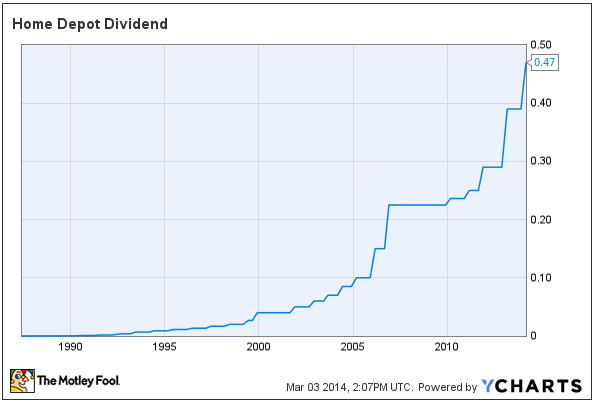 Home Depot announced a 21% increase in its dividend for fiscal 2014, which brings the dividend yield to 2.3%. The payout ratio is in the area of 40% of earnings, and the business is firing on all cylinders, so investors have valid reasons to expect growing distributions from the company in the years ahead.