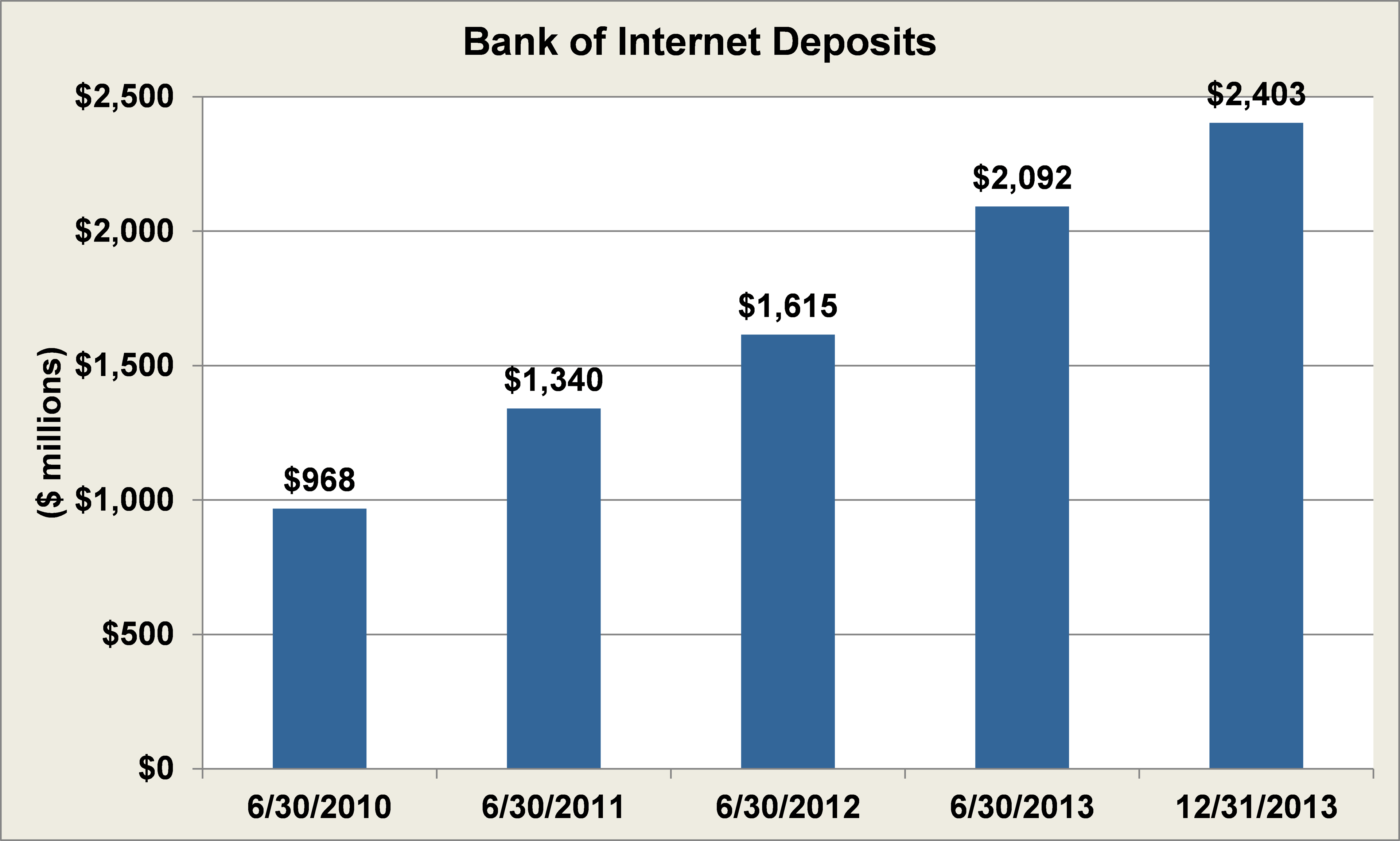 Yet perhaps the best example of this change may be Internet-only Bank of Internet, which has seen its deposits balloon from less than $1 billion to $2.4 billion since 2010: