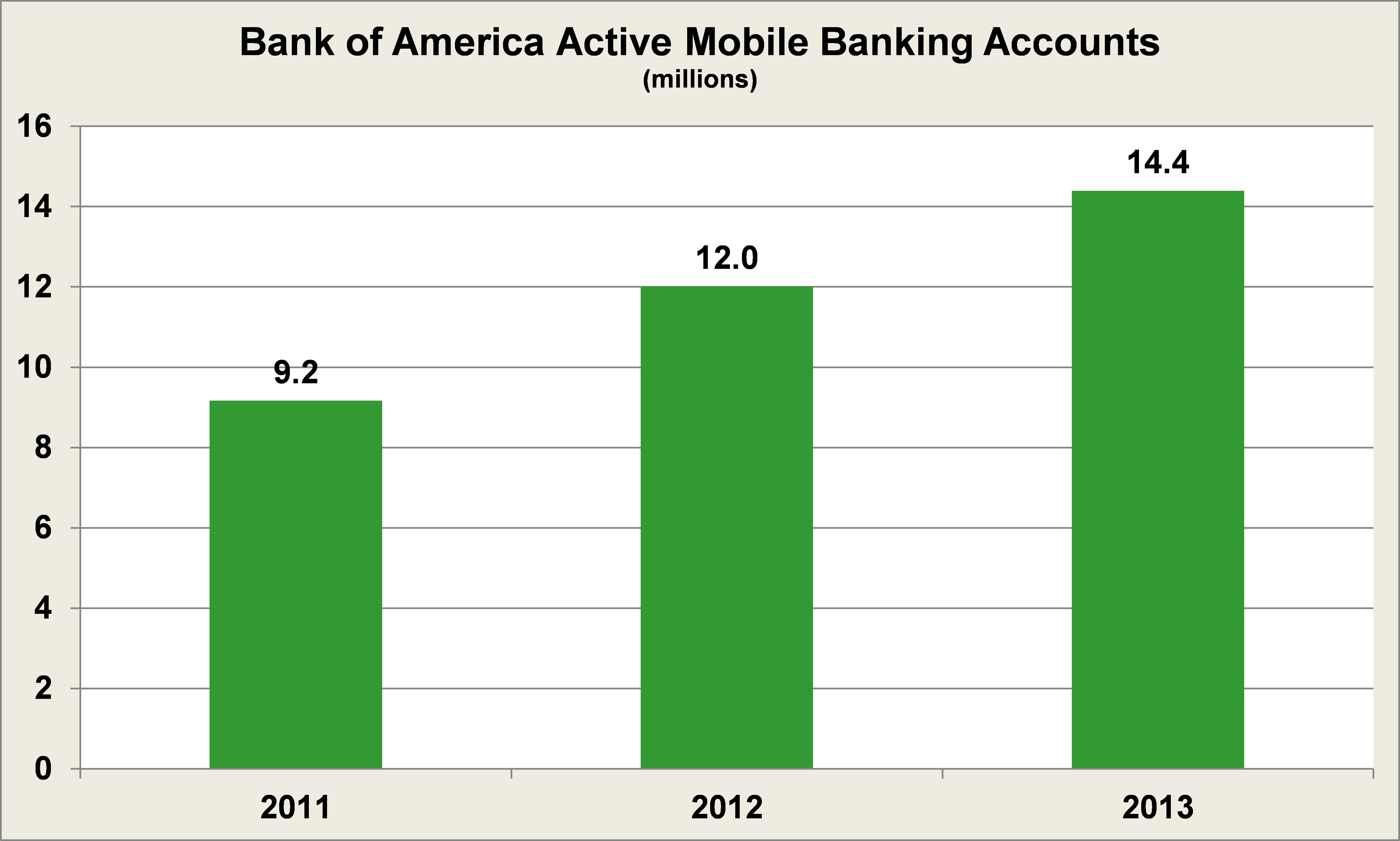 The biggest banks have also been responsive to this change. Bank of America has made massive efforts to expand its customers' use of its mobile app, and has been met with great success. Its active mobile banking accounts has risen by almost 60% over 2011 levels: