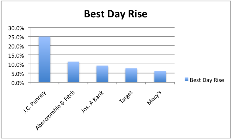 One of the strongest retailer winners for the week was Jos. A. Bank (NASDAQ: JOSB). Shares of the suit store rose 9% on Monday and 13% for the week after news broke that larger competitor Men's Wearhouse had offered to buy the company for approximately $1.8 billion. The offer was the third of its kind and was initiated in the hopes that Jos. A. Bank would sell out as opposed to acquiring Eddie Bauer for $827.2 million.