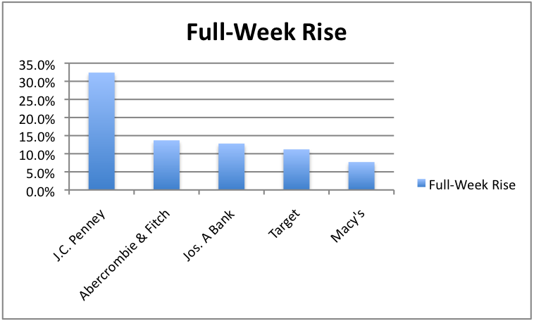 For the week, shares of J.C. Penney (JCP +0.00%) soared a whopping 32% to close at $7.28 after the company reported attractive earnings for the fourth quarter of its 2013 fiscal year. Currently, shares are up 49% from their 52-week low. But with the stock trading at a 63% discount to its 52-week high, there's still plenty of upside potential.