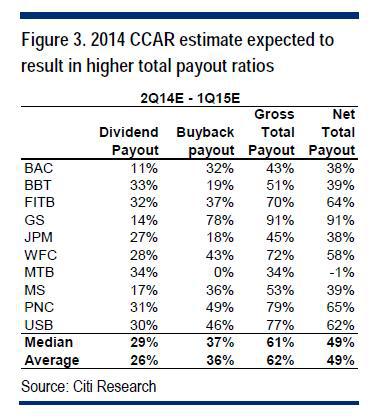 Banks with lower price to book ratios tend to have a higher portion of their payouts slated for buybacks. More easily said, the banks can get a bigger bang for their buck by repurchasing shares. For Bank of America in particular, it's able to repurchase shares at a 20% discount to its book value and reduce share count, which fell over 2% in 2013.
