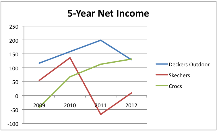 Looking at revenue, we can clearly see definable trends with both Deckers and Crocs. When it comes to net income, though, there is no clear trend. All three shoe retailers experienced volatility, which makes it difficult to tell which is the better prospect at first glance. However, it should be noted that while each company's profitability has been uncertain, Deckers' five-year net profit margin came out to 12.6% at a time when Crocs and Skechers reported average net profit margins of 5.2% and 2%, respectively.
