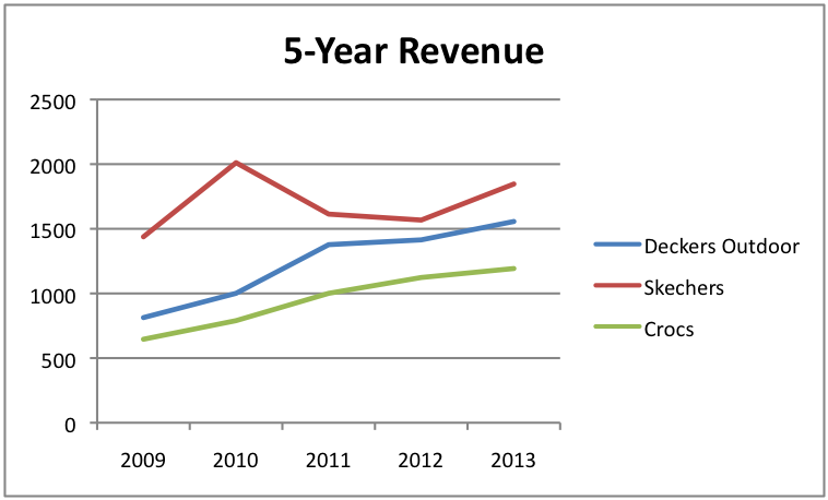 Based on the data presented above, it looks as though Deckers is a high-quality company that is still experiencing a growth spurt. Yes, the business' profitability will likely remain less than stellar throughout 2014, but its long-term track record of revenue growth and high margins likely mean that it offers opportunities that neither Crocs nor Skechers can. In the event that Deckers isn't to your liking, though, Crocs looks like it could make for an interesting prospect because of its smaller size and strong revenue growth rate.