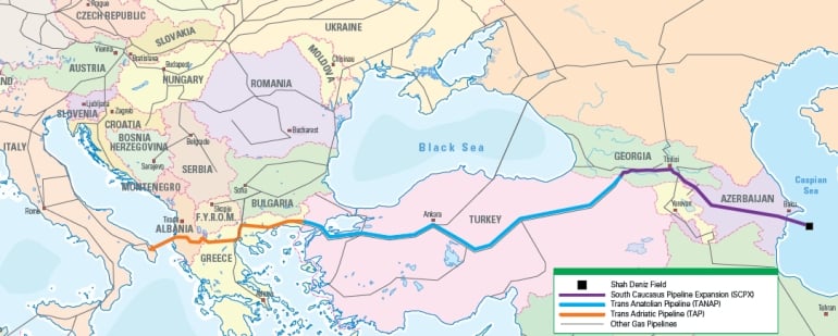 Shah Deniz and the adjacent work on the Trans-Anatolian and Trans Adriatic Pipelines would be one of the first established links between the gas fields of the Caspian Sea and continental Europe that would not traverse either Ukraine or Russia. Once fully complete, the entire project will supply Turkey and European companies with 2.5 billion cubic feet per day. This amount is equivalent to almost 10% of Europe's total imports.