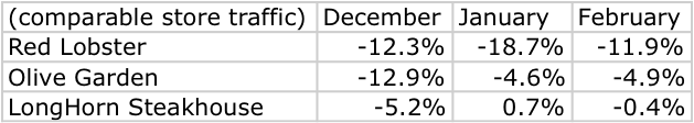 Based on the table above, we can see that Darden experienced significant declines in sales in its Red Lobster and Olive Garden chains during the three-month time-frame. The worst performer, by far, was the company's Red Lobster segment, which saw sales fall 8.8% between December and February.