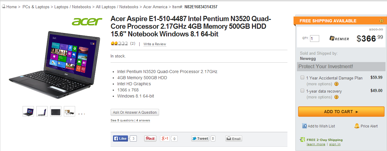 It's actually an interesting exercise to compare this device with a comparably priced Windows 8.1 notebook. In this case, a scan of Newegg.com reveals that a close competitor is this $366 notebook from Acer: