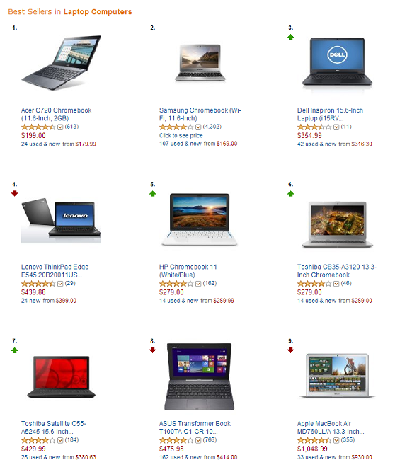 The interesting thing here is the pricing of the new Chromebook. The best-selling notebooks seem to be, unsurprisingly, the cheapest ones (sans the MacBook Air). While the new Chromebook is obviously better/faster, there is probably some very real price elasticity in the low end notebook/Chromebook market. At $399+, many will probably go with a full Windows 8.1 device. The value in these Chromebooks seem to be as secondary/tertiary devices, which would explain the high sensitivity to price. Note that the Acer laptop, even with a fan, seems to sell better than the first-gen Samsung simply because it's a mere $44 cheaper.