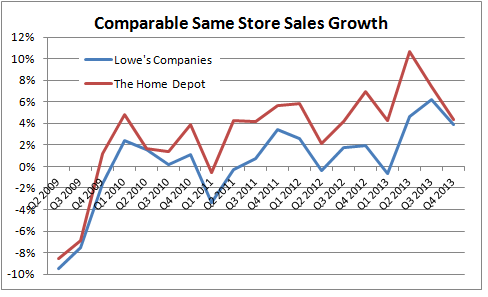 Moreover, Lowe's has now finished its first round of "value improvement line reviews." This was an initiative to normalize inventory levels across all of its product lines. The plan contributed to Lowe's growth in 2013 and will do so again in 2014, but after that Lowe's might find it harder to generate growth. Home Depot may prove to be a better option for pure housing exposure, but both stocks will do well if the housing market remains strong.