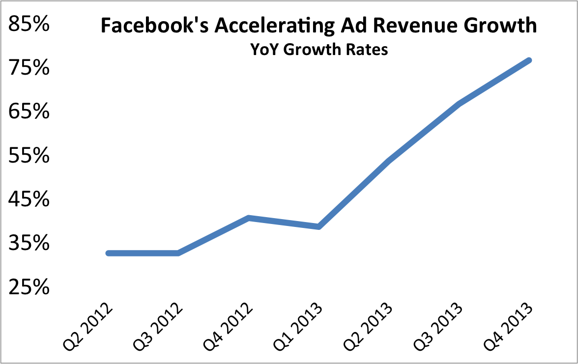 Consider Facebook and Twitter for instance. Not only is Facebook's revenue growth staggering, but its year-over-year ad revenue, which accounts for 90% of the social network's total revenue, is actually growing at accelerating rates.