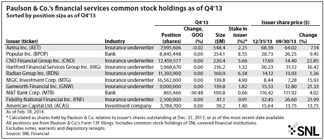 According to the latest SEC filing for the $20 billion portfolio, Paulson & Co. held $1.9 billion in the common stock of financial companies. Yet unlike some major investors -- like Warren Buffett -- Paulson abstained from holdings in the largest banks, apart from a nearly $185 million position in warrants of Bank of America (BAC +0.97%), and instead clung to insurers: