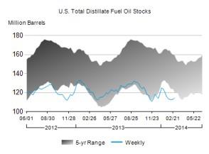 Distillates supplies, which include diesel and heating oil, increased 1.4 million barrels (1.2%) for the second week of expansions. Distillates demand for the last four weeks is down a seasonally adjusted 4.3% compared to the same period last year. In the past year, distillates inventories have fallen 4.9%.