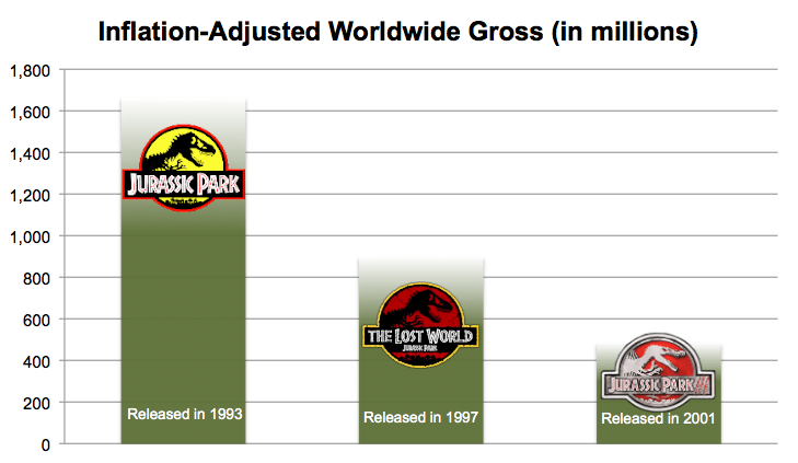 On average, the inflation-adjusted gross of its three predecessors -- 1993's Jurassic Park, 1997's The Lost World: Jurassic Park, and 2001's Jurassic Park III -- is a little over $1 billion per film. The first installment has been the most successful by far, and even though the third made significantly less, it still generated a profit of $275 million. In fact, no Jurassic Park film has had a budget above $100 million, which makes early rumors -- claimed by a source with "insider information" -- of a $200 million budget for Jurassic World all the more intriguing.