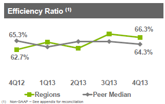 One of the troubling things at Regions was the reality that while almost all of its peers were cutting costs and reducing expenses, those at Regions actually rose -- albeit slightly, by $30 million, or 1% -- which was truly out of the ordinary. In its own presentation it revealed its efficiency ratio -- a key measure of banking profitability that evaluates the cost of each dollar of revenue -- moved in the wrong direction.