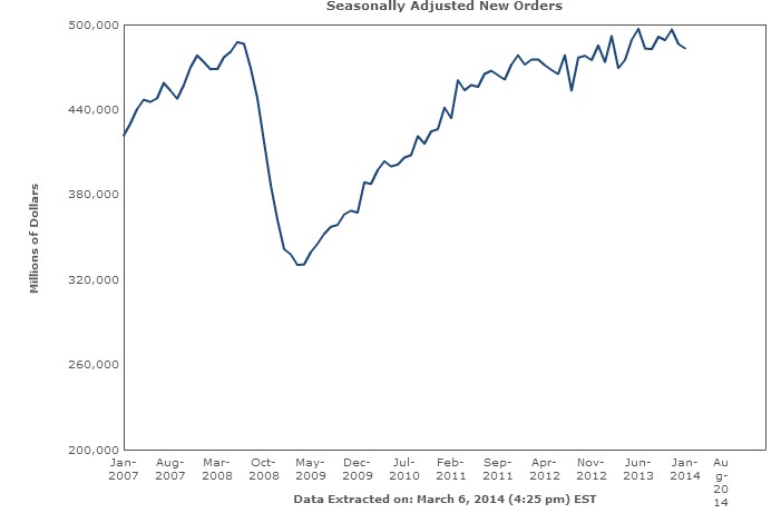 While a portion of the January decrease is due to volatile aircraft orders, motor vehicles put on the brakes once again. After dropping 1.2% in December, new orders for automobiles and parts shaved off another 0.9%.