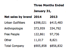 According to its preliminary release, management attributed the lackluster sales to a 4% sales decline in its namesake brand. Fortunately, the 12% jump in sales experienced by its Anthropologie brand combined with the 15.5% rise in revenue for the company's Free People brand helped cushion the shortfall.