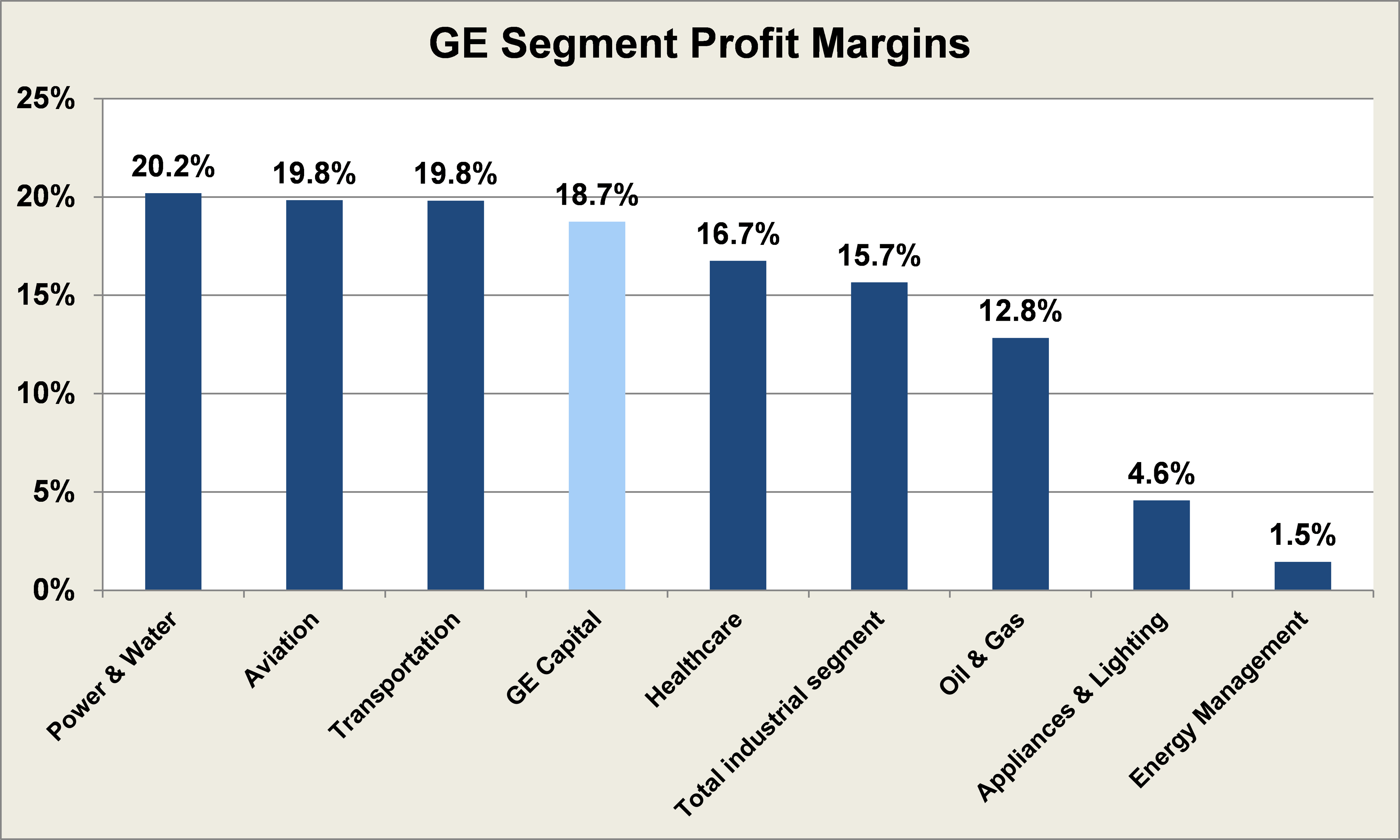 As shown above, GE Capital was able to eclipse the profitability of the total industrial segment by 3 percentage points. While that may not sound significant, when you consider GE Capital had $44 billion in total revenue, moving from 18.7% to 15.7% would mean $1.4 billion less in profit for the segment, and General Electric as a whole.