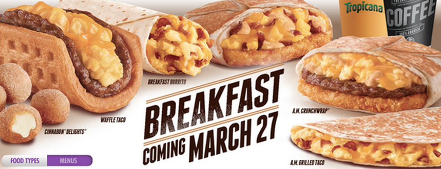 Yum! Brands-owned Taco Bell said it will launch a nationwide rollout of its new breakfast products on March 27. The rollout, which will include the taco waffle and Taco Bell's A.M. crunchwrap, marks the largest menu expansion in the company's history. It also puts pressure on Starbucks to step up its own breakfast offerings. To keep stride with rivals such as Yum! Brands in the morning day-part, Starbucks introduced four new breakfast sandwiches: slow-roasted ham and Swiss on a croissant, vegetable and cheese on a ciabatta bun, egg and cheddar on multigrain toast, and a reduced-fat turkey bacon sandwich. Are you hungry yet?