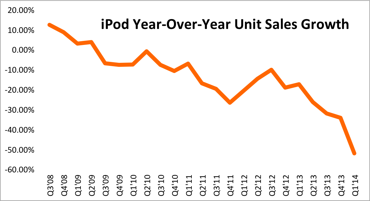 Specifically, Apple's year-over-year iPod unit sales declined by a whopping 52% in the company's most recent quarter. Apple CEO Tim Cook said in the first-quarter earnings call that "all of us have known for some time that iPod is a declining business." Apple's iPod business accounts for less than 2% of the company's total revenue.
