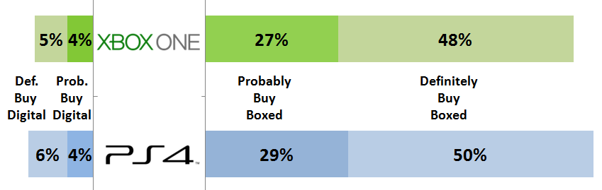 Even though 48% of Xbox One owners and 42% of PS4 owners had purchased at least one full-price digital title, these games only accounted for a small percentage of total games sold. Over 75% of the PS4 and Xbox One titles purchased by the CBSi audience were boxed retail copies.