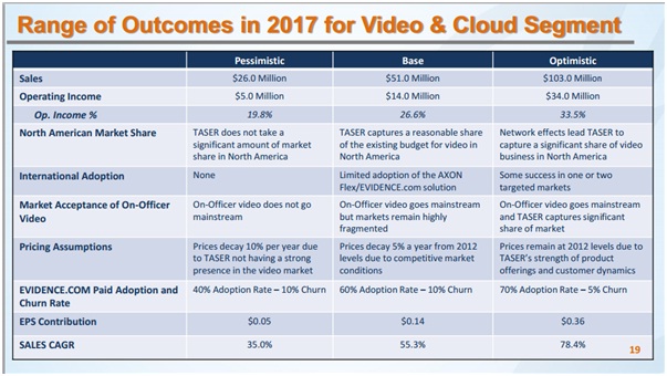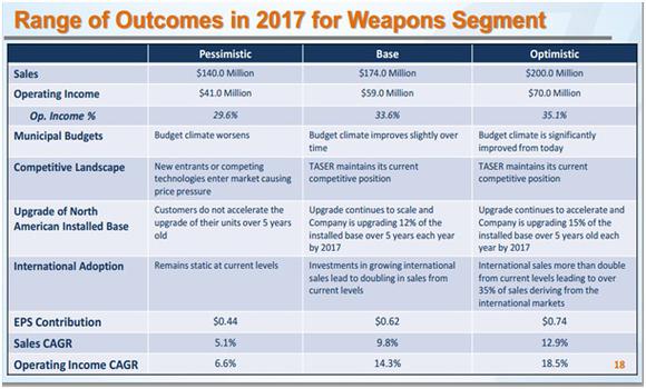 TASER has predicted that even in the worst possible situation, the weapons business can generate $140 million in annual sales by 2017. This is nearly 10% more than the segment's 2013 sales. In base case scenario, the segment can generate $174 million or 36% more, and if TASER gets lucky, it's possible that revenue can go up by 57% to $200 million. The outcome matrix with different assumptions from the company's latest investor presentation is given below.