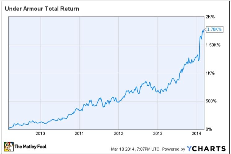 Under Armour (UA 0.22%) has been one of the most explosive growth stories in the consumer sector over the past few years, and the company has delivered mind-blowing gains for investors. But Under Armour is now trading near historic highs, and the stock is valued at a considerable premium versus competitors such as Nike (NKE 10.44%) and lululemon athletica (LULU 2.63%). Is it too late to invest in Under Armour, or does the stock still have room to run?