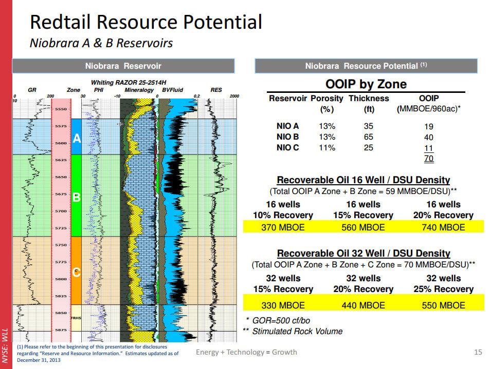 Whiting sees three oil rich zones underneath much of its acreage. This provides it with the opportunity to drill 16 to 32 wells in a drilling section as it looks to recover a portion of the original oil in place as the following slide shows.